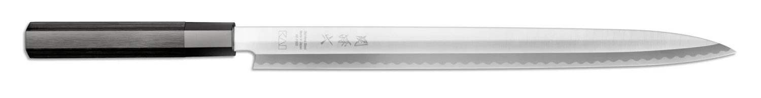 Die japanischen Filiermesser der Seki Magoroku KK Yanagiba Serie zeichnen sich durch ihre puristische Formsprache und dem oktogonalen, schwarzmatten Pakkaholzgriff aus. Die extrem lange, schlanke Klingenform ermöglicht hauchdünne, präzise Schnitte – perfekt zum Filetieren von Fisch. Die einseitig geschliffene Schneide des Yanagibas ist aus rostfreiem Carbonstahl gefertigt und ist mit einer weichen, wellenförmigen Linie als satiniertes Finish verziert. Die KK Serie verbindet robuste Qualität mit schlichter Funktionalität.